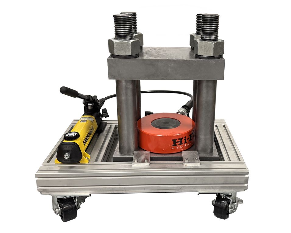 The load cell calibrator is a precision laboratory instrument designed for the accurate calibration of load cells used in testing presses such as the GEOTEST and ROCKTEST series. It operates by comparing the readings of the load cell under test with a high-accuracy reference sensor, ensuring precise and reliable force measurements. The press generates loads through a hydraulic actuator powered by a hand pump. A digital display provides real-time readings of both reference and test sensors with ±0.02 % accuracy. Built with a sturdy frame, the system ensures stability and repeatability during calibration. The calibration process involves applying controlled pressure and recording data to produce regression and calibration curves, guaranteeing consistent performance and traceable results for a wide range of load cells.