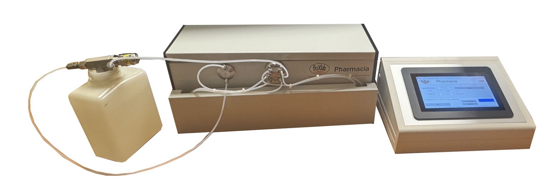 The Pharmacia metering pump is designed for high-accuracy liquid metering under continuous flow and pressure conditions, making it suitable for processes requiring highly stable and reproducible dosing, such as controlled reagent addition and continuous feed applications in medical, pharmaceutical, chemical, and biological systems. The pump incorporates a dual-piston architecture operating in antiphase, whereby one piston delivers fluid while the second piston simultaneously refills. This configuration, combined with an automatic switchover valve, minimizes pulsation and ensures a quasi-continuous flow profile. System operation is optimized for precision and repeatability through Floxlab’s dedicated data acquisition and control software, which enables fine, real-time adjustment of flow rate or pressure to meet specific process setpoints. The pump can be controlled either via a computer interface or an integrated touchscreen panel. The control software, compatible with both platforms, provides direct access to all operational functions, including pump start/stop commands, selection of constant flow or constant pressure control modes, input of operating parameters such as flow rate, pressure limits, and target volume, and continuous real-time monitoring of key process variables, including pressure, flow rate, and cumulative injected volume.